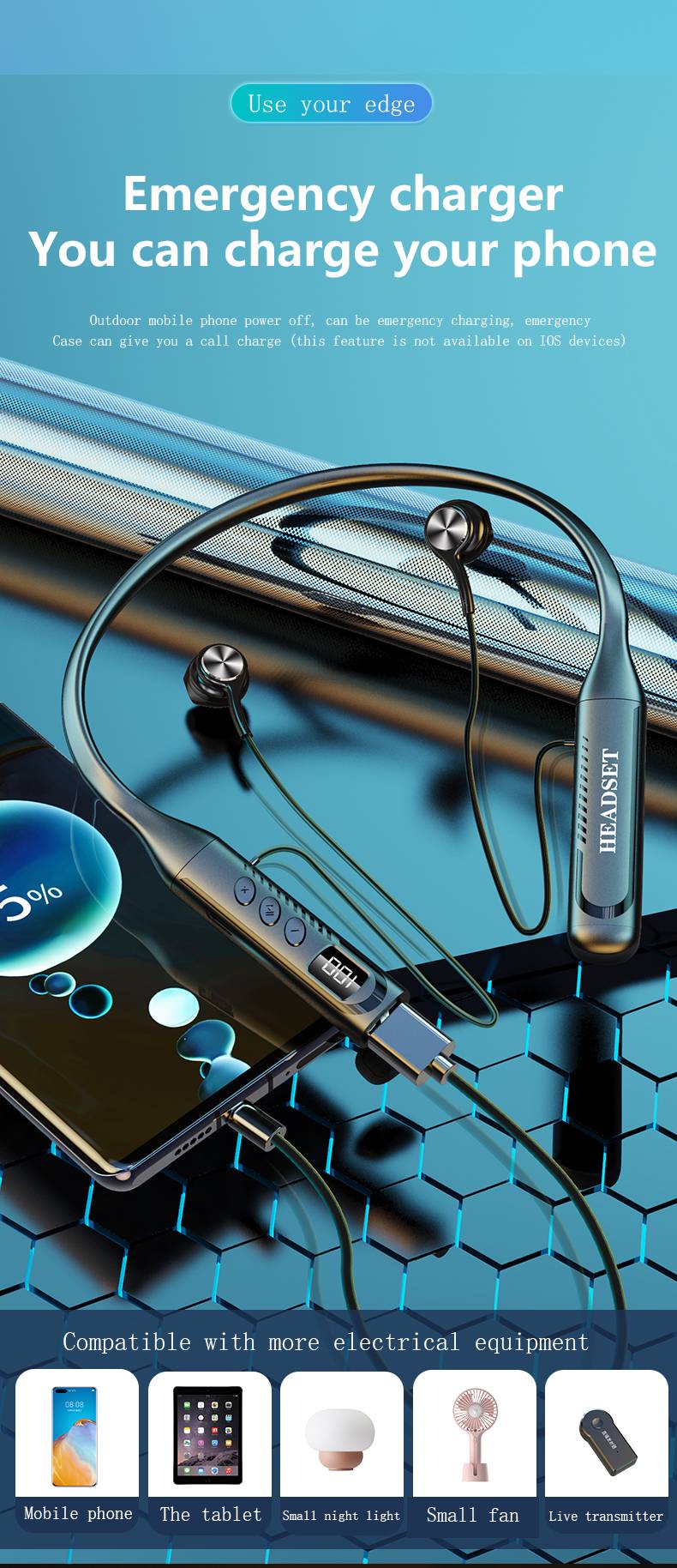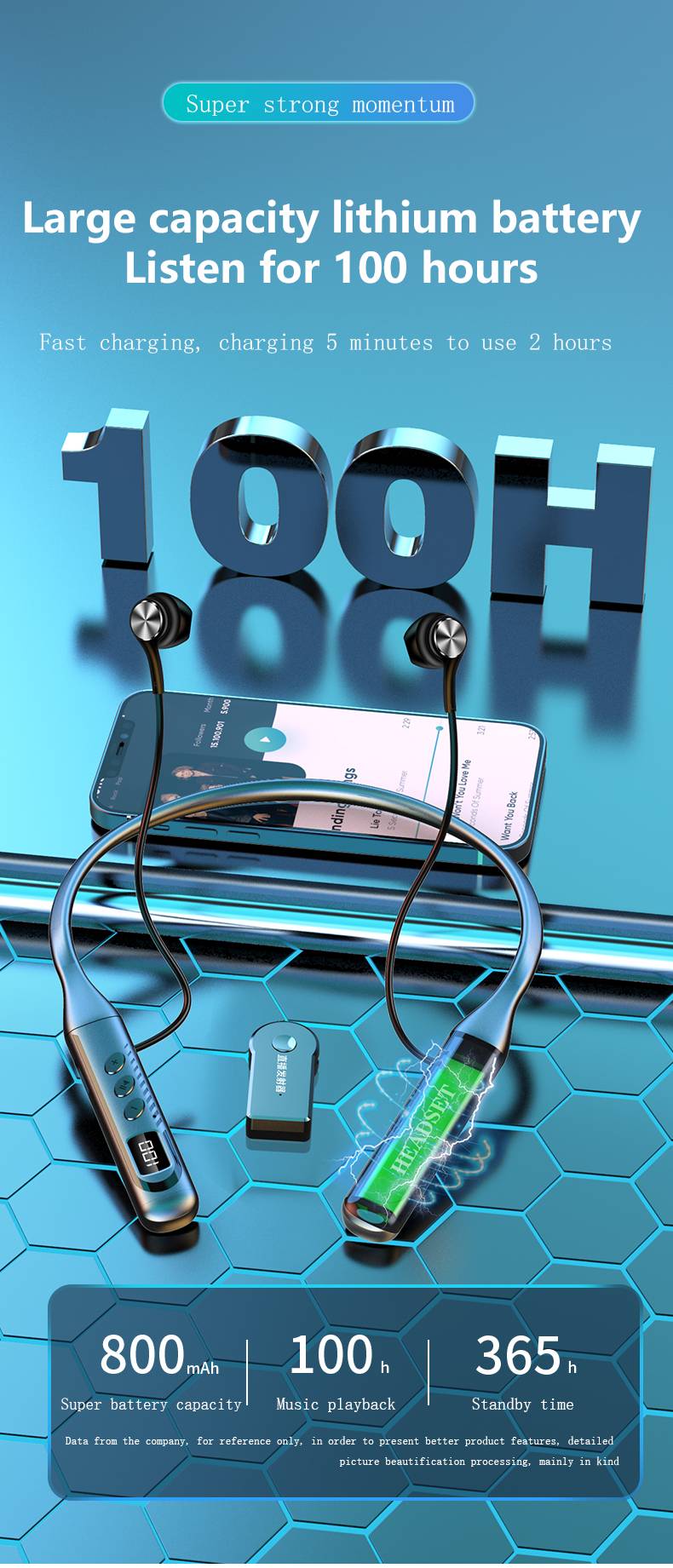Wireless neckband Bluetooth earphones for sports, with ultra long battery life and large capacity
