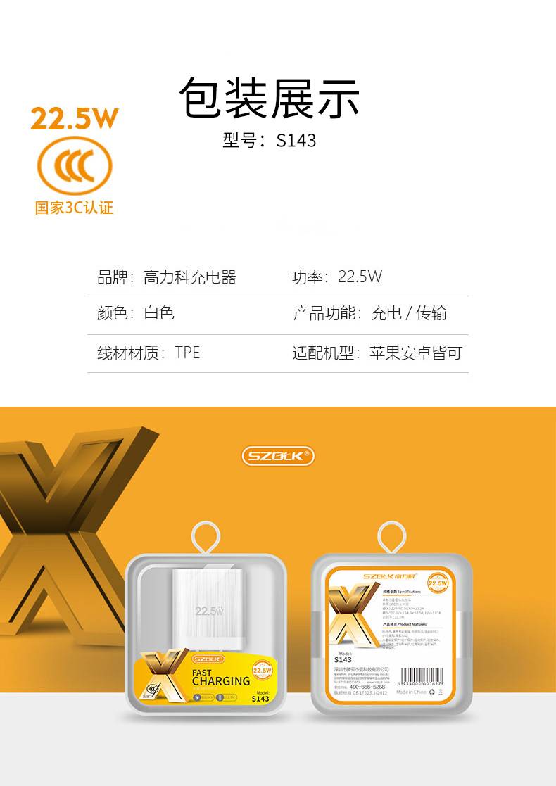 高力科S143 5V3.5A 22.5W手机充电器套装手机通用充电头