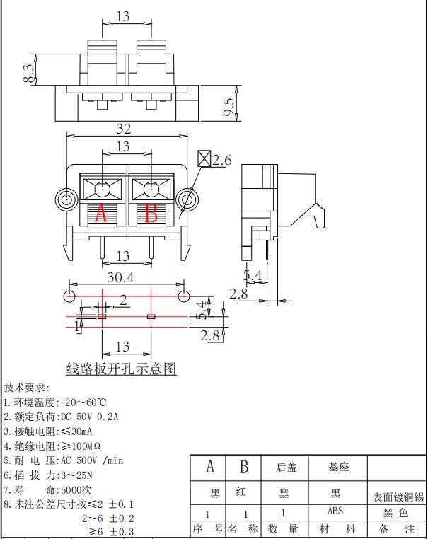外接线夹 音频输出输入座 专业制造厂家 WP2-19 插座黑红 2位