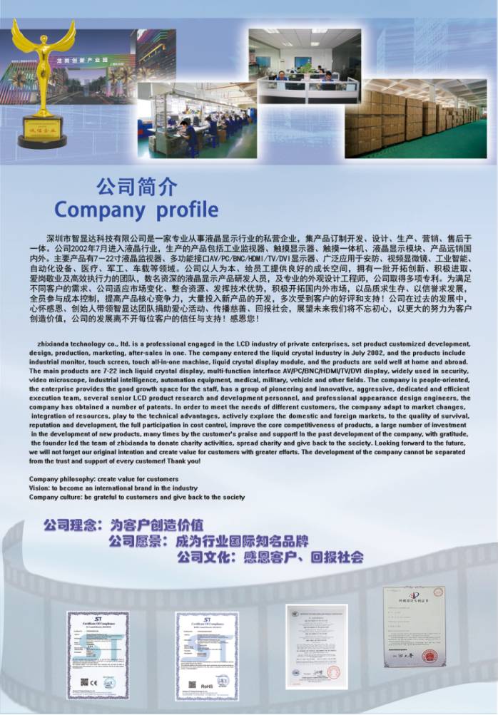 深圳市智显达科技有限公司是一家专业从事液品显示行业的私营企业,集产品订制开发、设计、生产、营销、售后于一体。公司2002年7月进入液品行业,生产的产品包括工业监视器、触摸显示器、触摸一体机、液品显示模块、产品远销医内外。主要产品有7-22寸液品监视器,多功能接口AV/PC/BNC/HDMI/TV/DV1显示器、广泛皮用于安防、视频是微镜、工业智能自动化设备、医疗、军工、车载等领域。公司以人为本、给员工提供良好的成长空间,拥有一批开拓创新、积极进取.爱岗敬业及高效执行力的团队,数名资深的液品显示产品研发人员,及专业的外观设计工程师,公司取得多项专利。为满足不同客户的需求、公司适应市场变化、整合资源、发挥技术优势,积极开拓国内外市场,以品质求生存、以信警求发展全员参与成本控制,提高产品核心竞争力,大量投入新产品的开发,多次受到客户的好评和支持!公司在过去的发展中心怀感恩、创始人带领智显达团队捐助爱心活动、传播慈善、回报社会,展望未来我们将不忘初心,以更大的努力为客户创造价值,公司的发展离不开每位客户的信任与支持!感恩您!