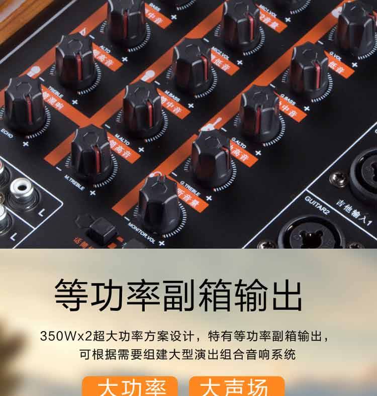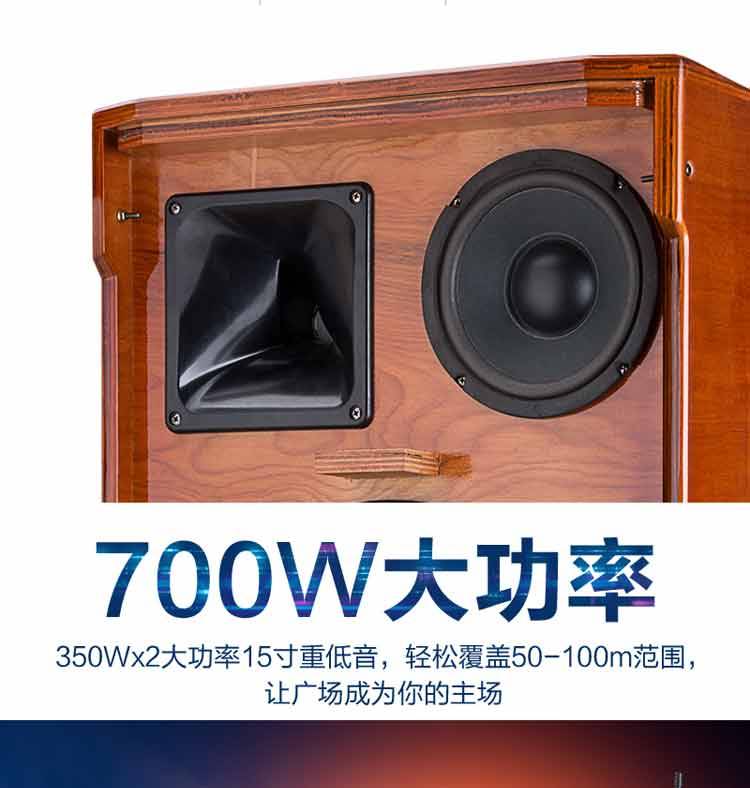 *350W*2超大功率方案设计,特有等功率副箱输出,支持升级副箱连接,可根据需要组建大型演唱组合音响系统,功率更大,声场更广阔。