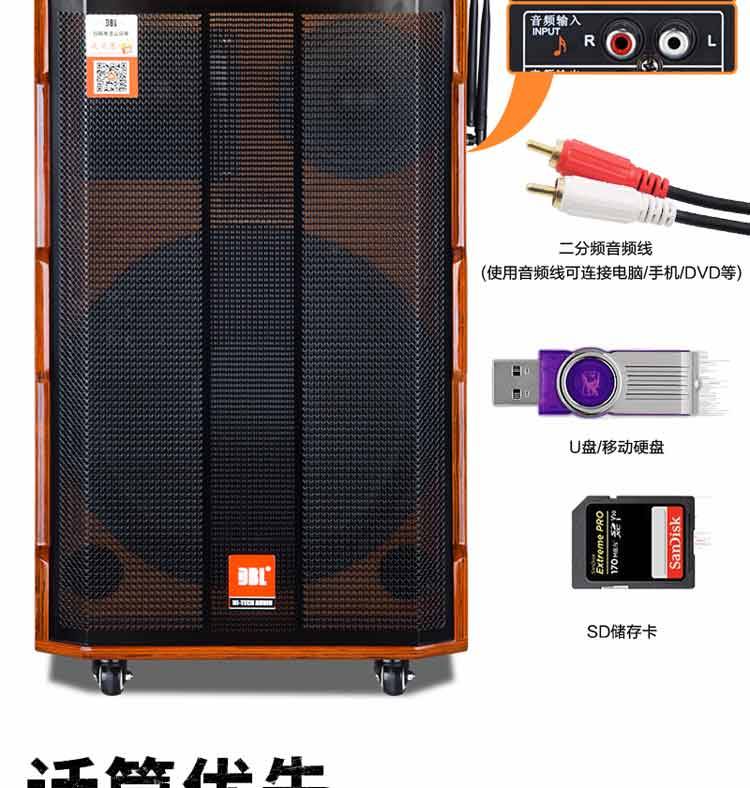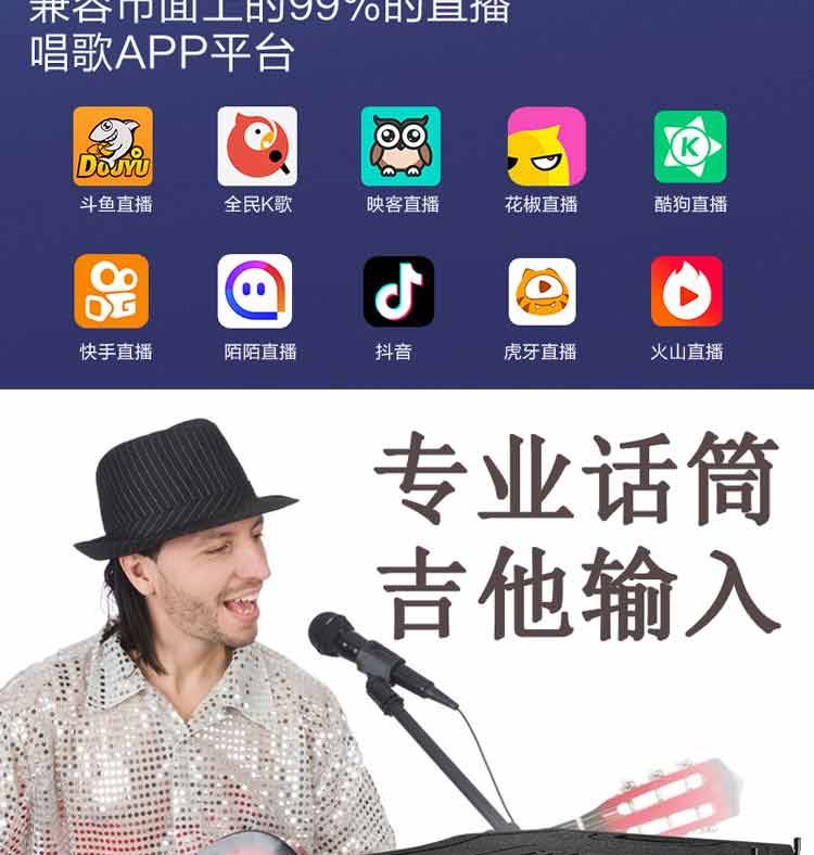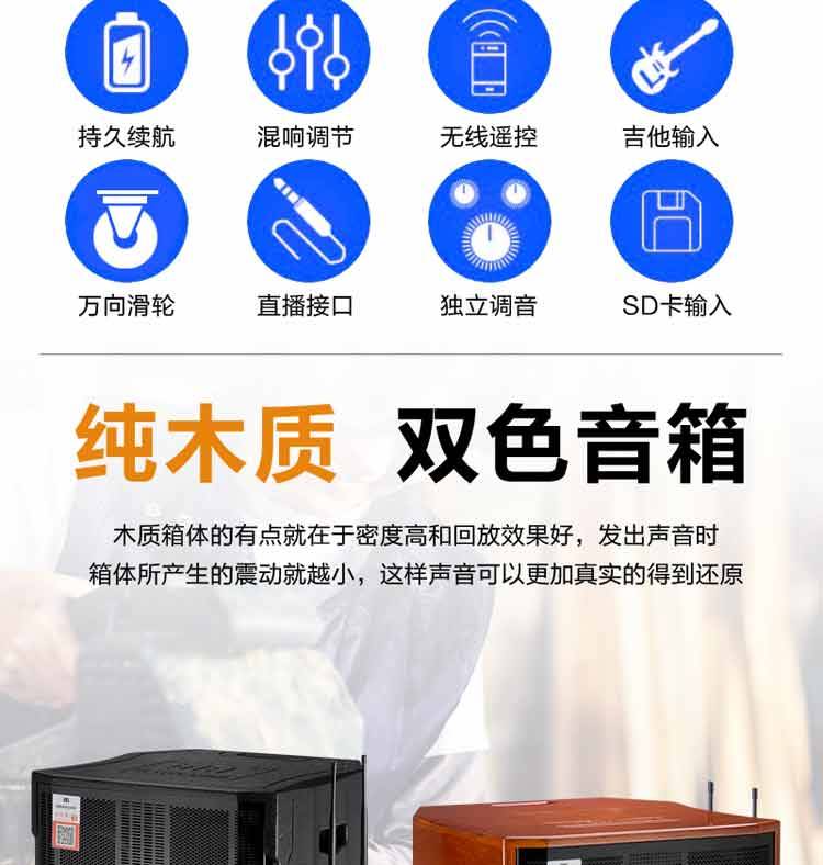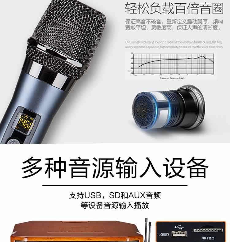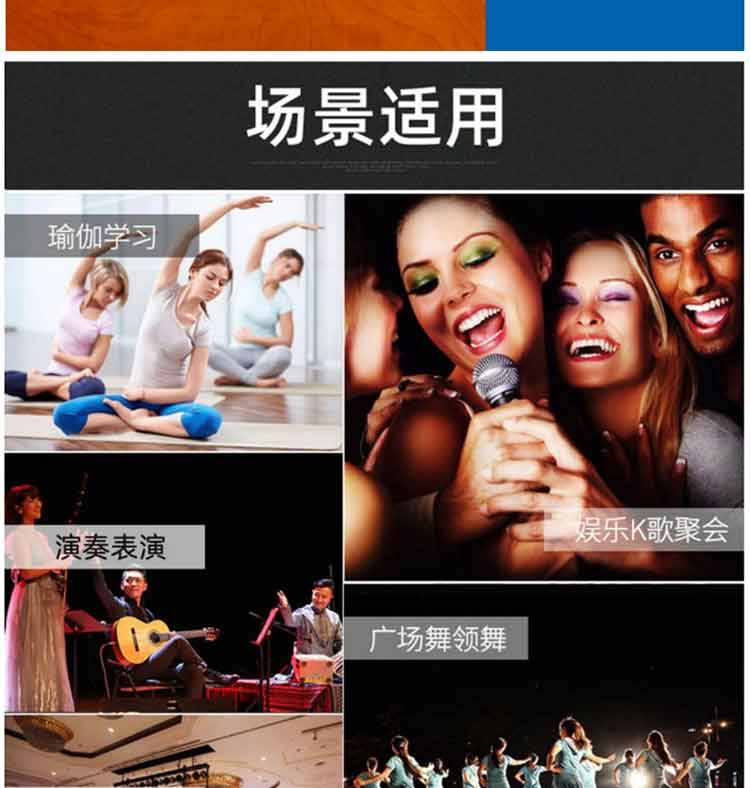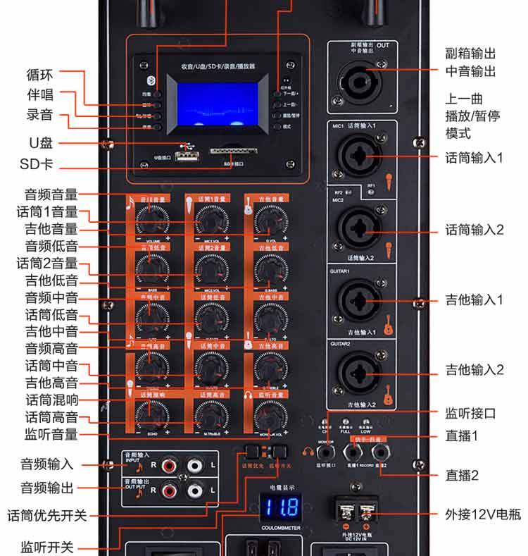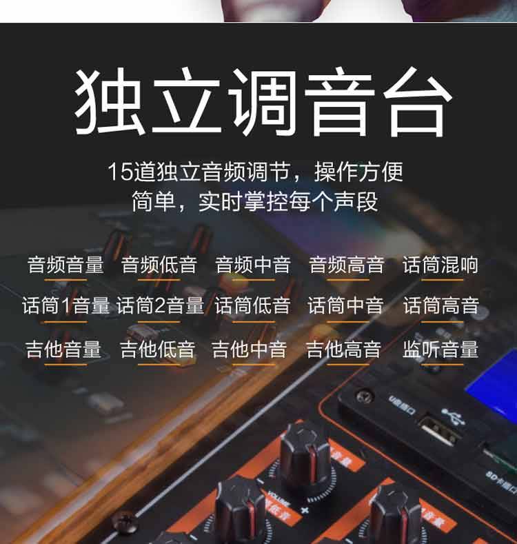 *支持USB/SD/FM/MP3及AUX多种信号输入连接,独立音乐高中低音调节,支持卡拉OK演唱、消原音、话筒优先、录音、循环播放、监听及吉他弹唱、手机直播都多功能于一体