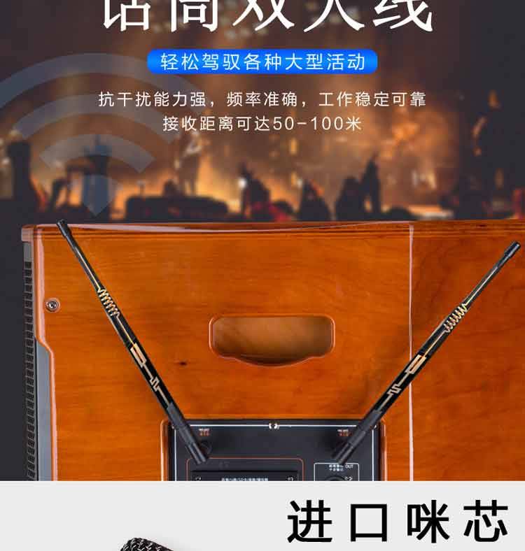 全金属网头及咪管,50个频段自动对频锁频,有效避免多话筒使用的同频干扰,50米以上超长接收距离,内置DSP人声处理芯片,完全满足大型场所的话筒扩音要求