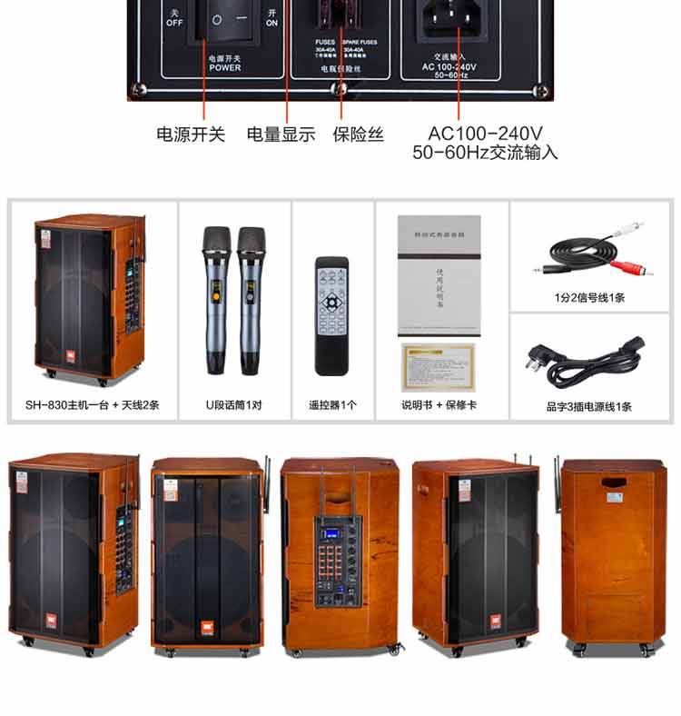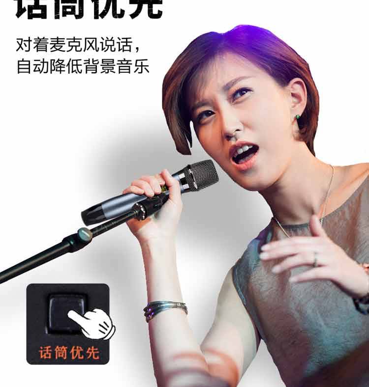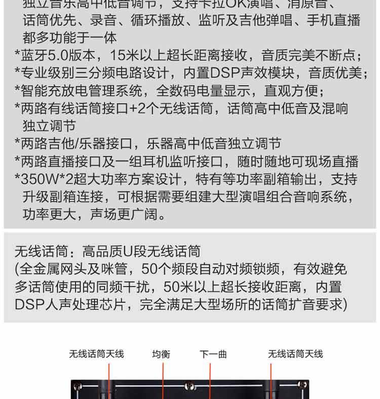 *两路有线话筒接口+2个无线话筒,话筒高中低音独立调节