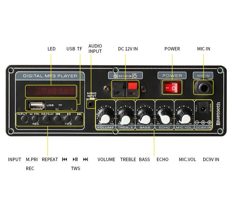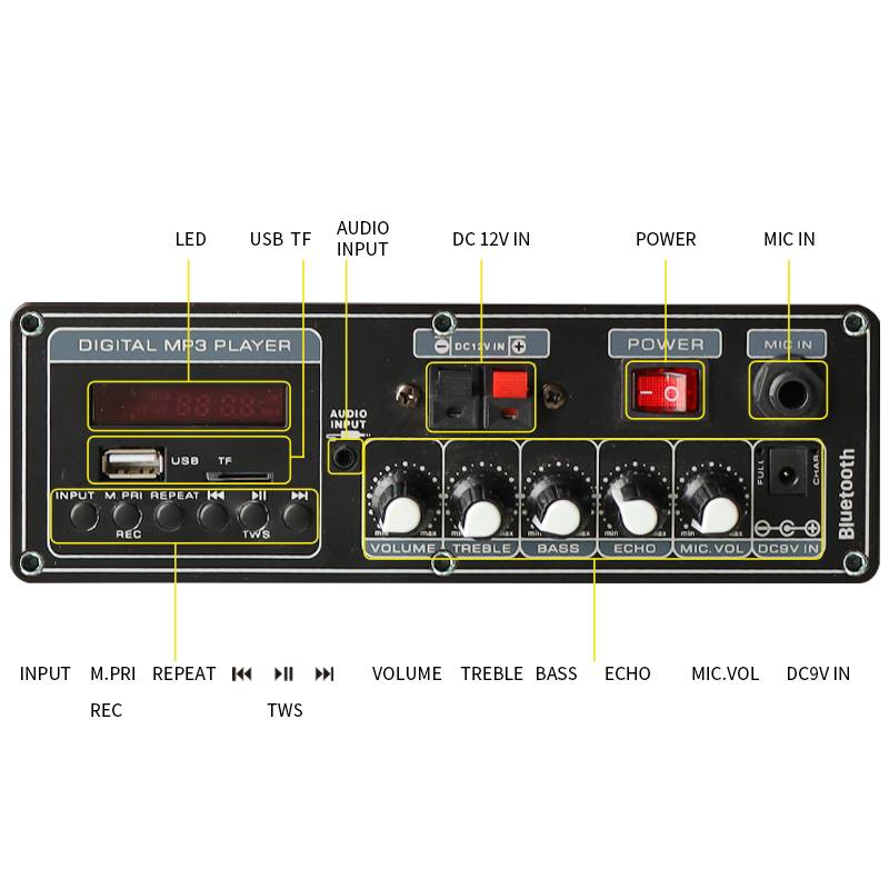 4.Function:Bluetooth/USB/TF/FM/Aux in/LED Screen