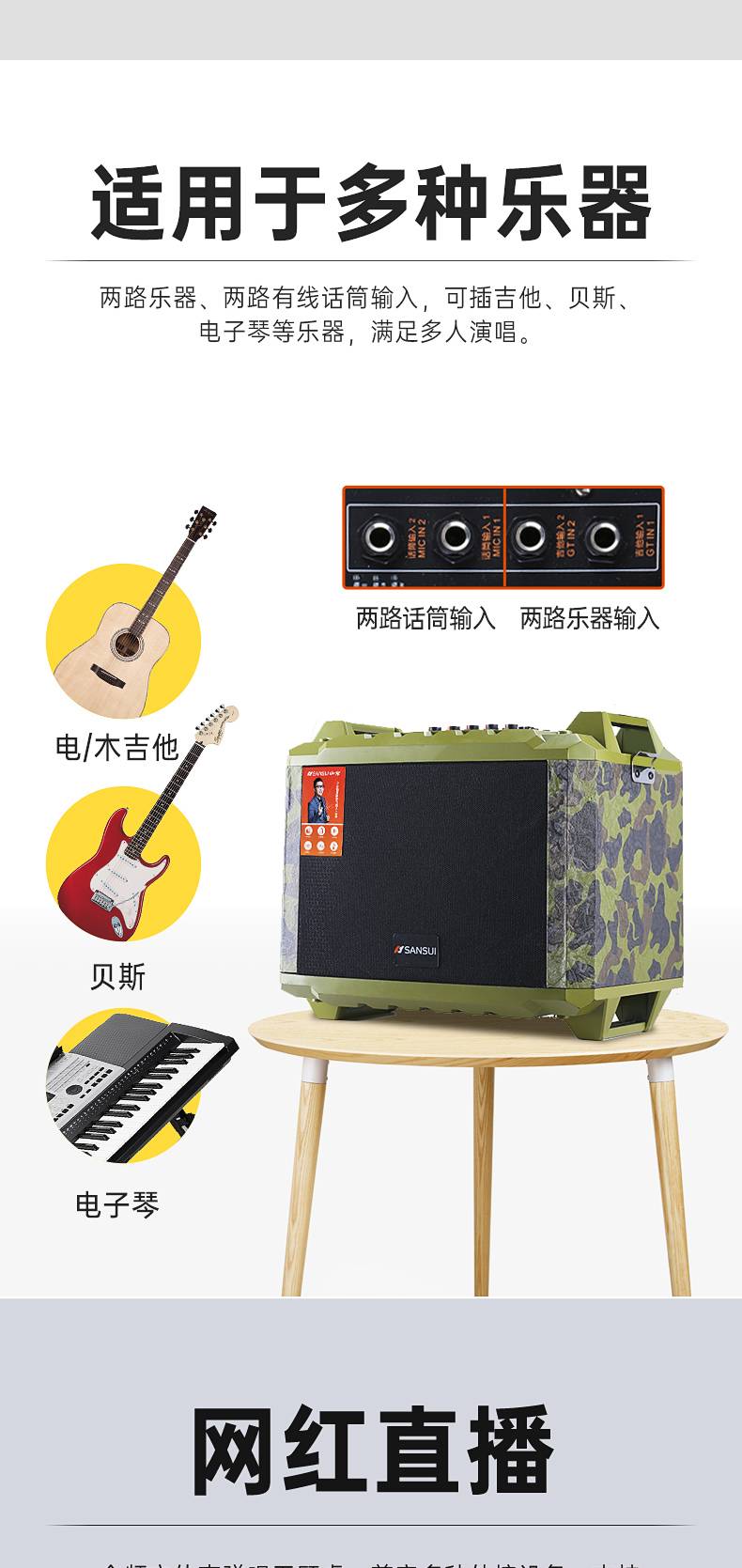 7、两路乐器输入,可插吉他 贝斯 电子琴 贝斯等乐器。两路有线话筒输入。