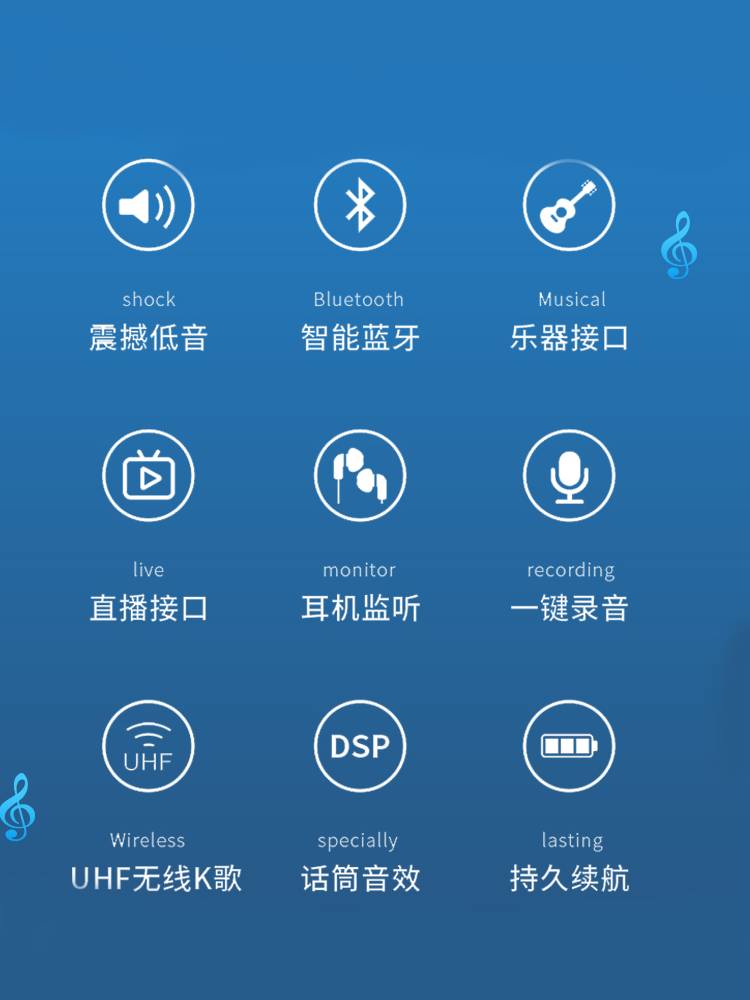 *震撼低音,智能蓝牙,乐器接口,直播接口,耳机监听,一键录音,UHF无线K歌,话筒音效,持久续航