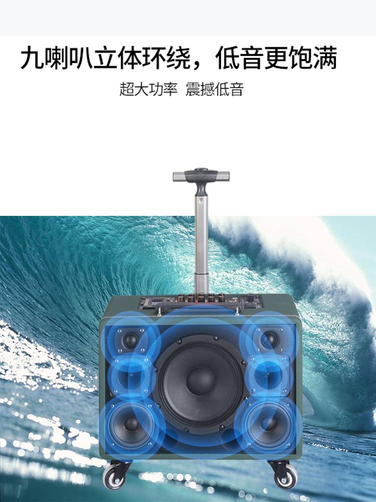 *铝合金拉杆,移动便捷;万向滑轮,便携省力;侧方位喇叭,真环绕立体声;底部支架孔,方便户外使用;顶部展示:皮革提手,多功能控制板