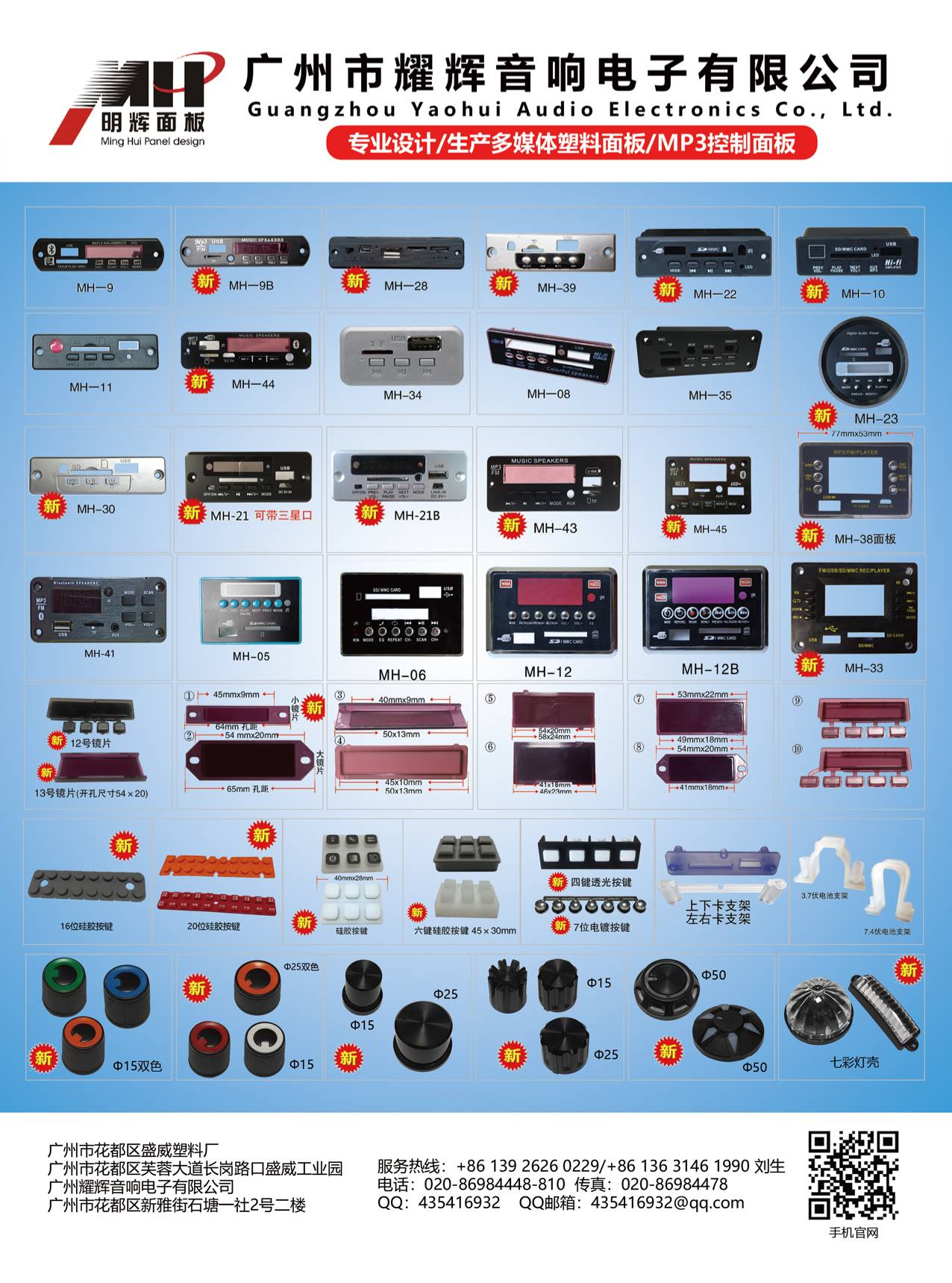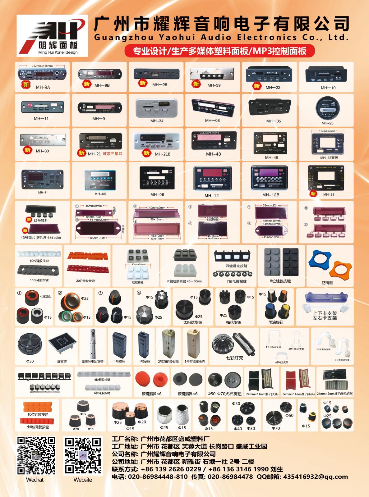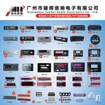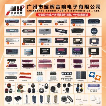 本公司专业生产销售音箱配件,产品包括MP3解码板面壳,功放板上的塑料按键,镜片,旋钮和硅胶按键!产品丰富,价格实惠,质量保证,多年来得到广大客户认可和支持!工厂名称为:(广州市花都区盛威塑料厂)明辉面板是本公司一张亮丽的名片,在行业内已经有12年历史,本公司设有开发部和销售部团队!工厂设有注塑部,真空电镀和喷漆车间.公司上下团结,众志诚成努力为客户提供最好的服务,欢迎新老客户来电咨询!